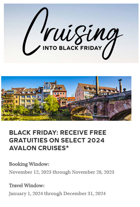 Save on gratuities with Avalon Waterways. Book an eligible cruise by November 28, 2023, to receive pre-paid onboard gratuities for the first 2 guests in your stateroom. Applies to select 2024 sailings.