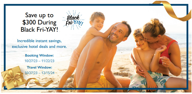 Jump into Black Fri-YAY! deals with Apple Vacations, Blue Sky Tours Hawaii, Funjet Vacations, or Travel Impressions through Nov 22, 2023. Save up to $300 on travel dates through Dec 15, 2024. Save more (up to $550) when you pay in full at booking.