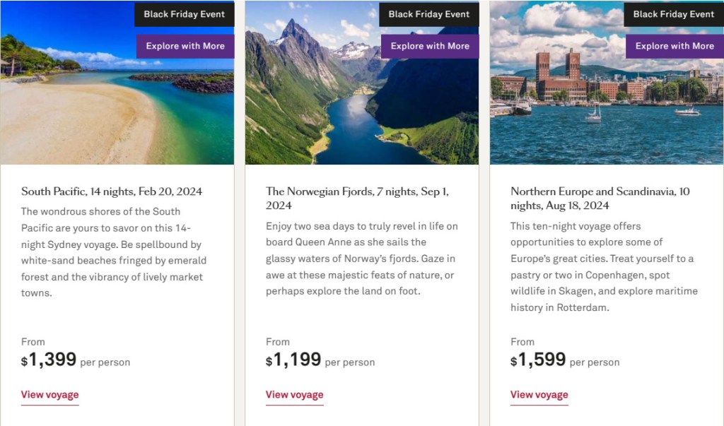 Select Cunard sailings start at $799 per passenger and include up to $1,000 onboard credit per stateroom during the luxury line’s Black Friday event – through Nov 26, 2023.