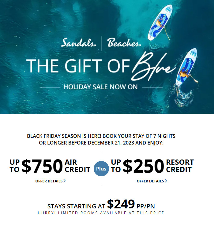 Sandals wants to help fly you to their all-inclusive resorts with an air credit of up to $750. Then enjoy up to $250 resort credit when you arrive. Must book by Dec 21, 2023, for travel through Nov 3, 2024. Valid only for stays of 7 nights or longer. Blackout dates apply. These savings are combinable with their other resort promos.